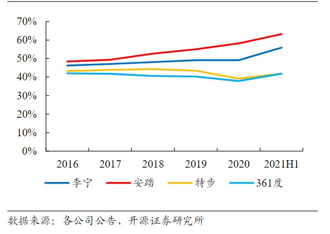 增长缓慢的毛利率是特步的另一大痼疾。近五年的财报显示,特步毛利率一直维持在40%至45%,和361°持平。与之形成对比的是,李宁已经上升至60%以上,安踏即将突破70%;净利率上,特步是四大品牌里最低的一个,只有10%。