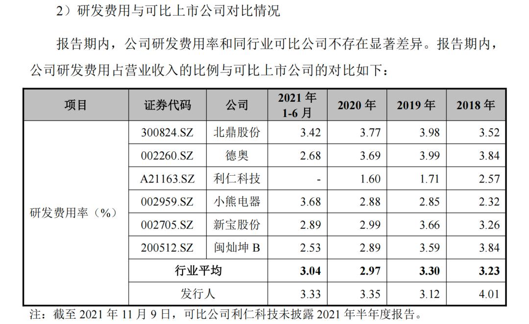 据比依招股书显示,比依电器、利仁科技、小熊电器等,研发费用占比均在3%左右。截至 2021年7月31日,比依电器发明专利仅8项;研发和技术人员 156 名,占员工总数的比例为 6.82%。员工配比结构侧面反映了空气炸锅制造业属性极强的特征。行业内拥有专利技术最多的企业嘉乐,据称已研发出400款空气炸锅和蒸汽炸锅。