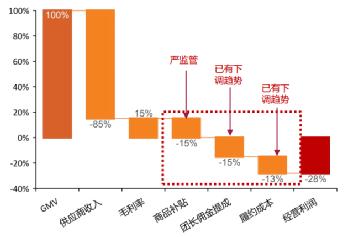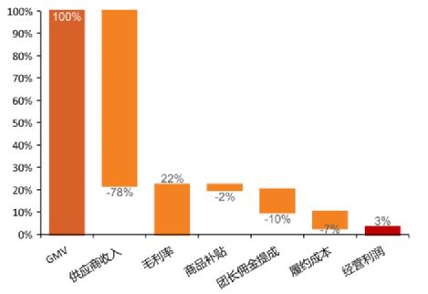 从社区电商的成本结构来看,主要是三个环节:商品、履约和获客。目前行业的整体商品毛利率是15%左右,整体并不高,因为社区电商经营的品类以水果、蔬菜等生鲜为主,基本都是毛利率不高的高频消费商品;且定位为下沉市场,本身零售价格并不高。这样的毛利率给履约和获客留下的利润空间就十分有限了。