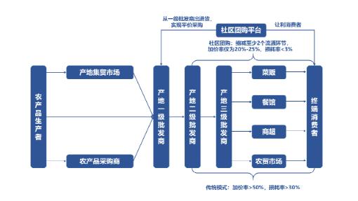目前社区电商平台多采用30%比例源头直采(生鲜)或全国总代理(标品),70%销地一批商+二批商(区域、当地供应商)的模式,相比社区生鲜店或菜市场多向销地三批、四批商进货,节省2-3层的商品流通环节,提高了商品周转效率,达到降低了损耗率和加价率的双重效果,与传统模式50%以上的加价率相比,社区电商模式的加价率为20%-25%。