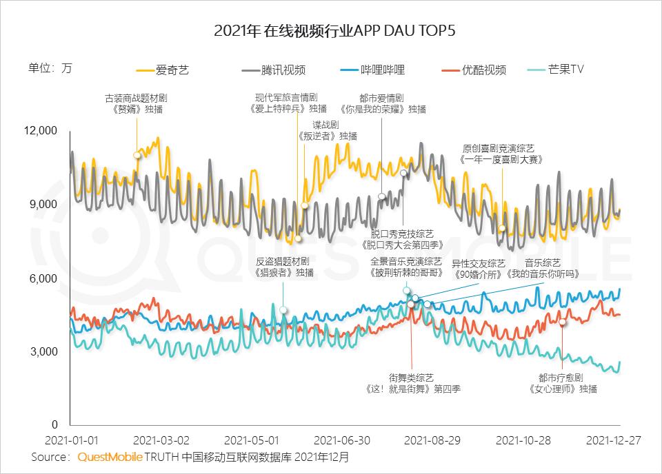 与会员增速放缓呼应,QuestMobile《2021中国移动互联网年度大报告》显示,2021年,芒果TV的DAU屡被优酷、B站压制,尤其是在9月以后,同时芒果TV的MAU也出现环比下滑,12月底的MAU较9月减少2000万。