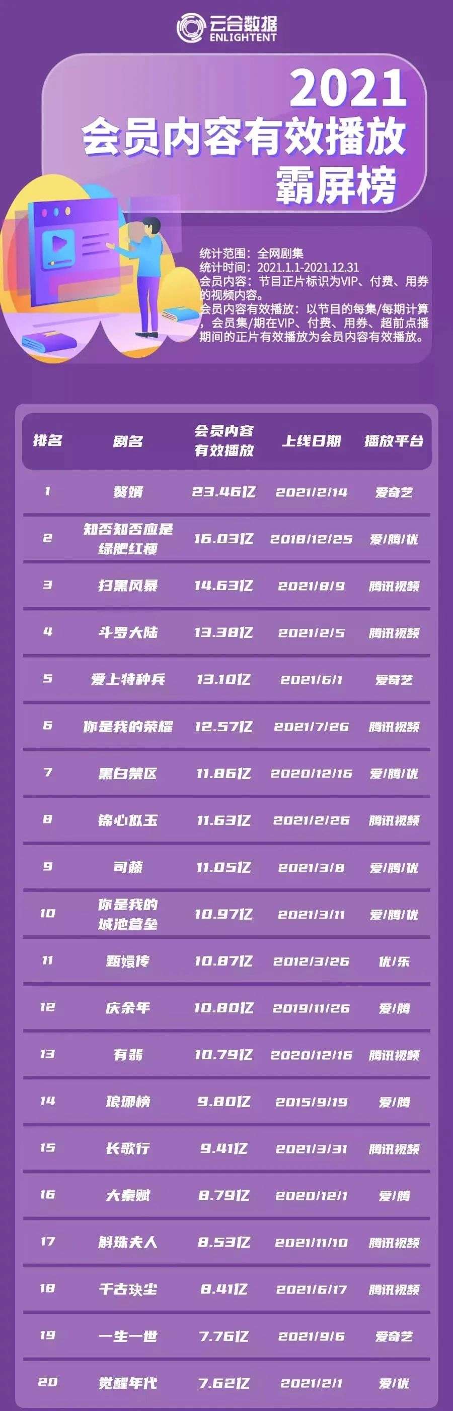 据云合数据,2021年,芒果TV独播剧比例由2020年的38%大幅上涨至59%,但在2021云合会员内容有效播放霸屏榜TOP20中,芒果TV却无一剧上榜。与之呼应,2021年,芒果TV剧集有效播放量同比下滑34%,剧集会员内容有效播放量同比下滑21%。