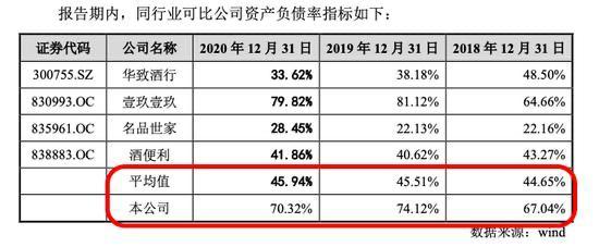 跟证监会2021年8月披露的酒仙网招股书, 更新后的IPO说明书特别提示了“偿债及流动性风险”。酒仙网在2018年、2019年、2020年报告期的负债率(合并)为67.04%、74.12%和70.32%,经营活动的现金来源于银行贷款,报告期内分别为1.266亿、2.642亿和3.48亿。