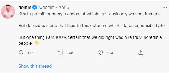 金融科技公司 Fast 的联合创始人兼 CEO Domm Holland 在声明中写道:“在打造无障碍的购物和销售体验这件事上,我们实现了优秀的成绩,但是今天我们做出了关闭公司的艰难决定。”