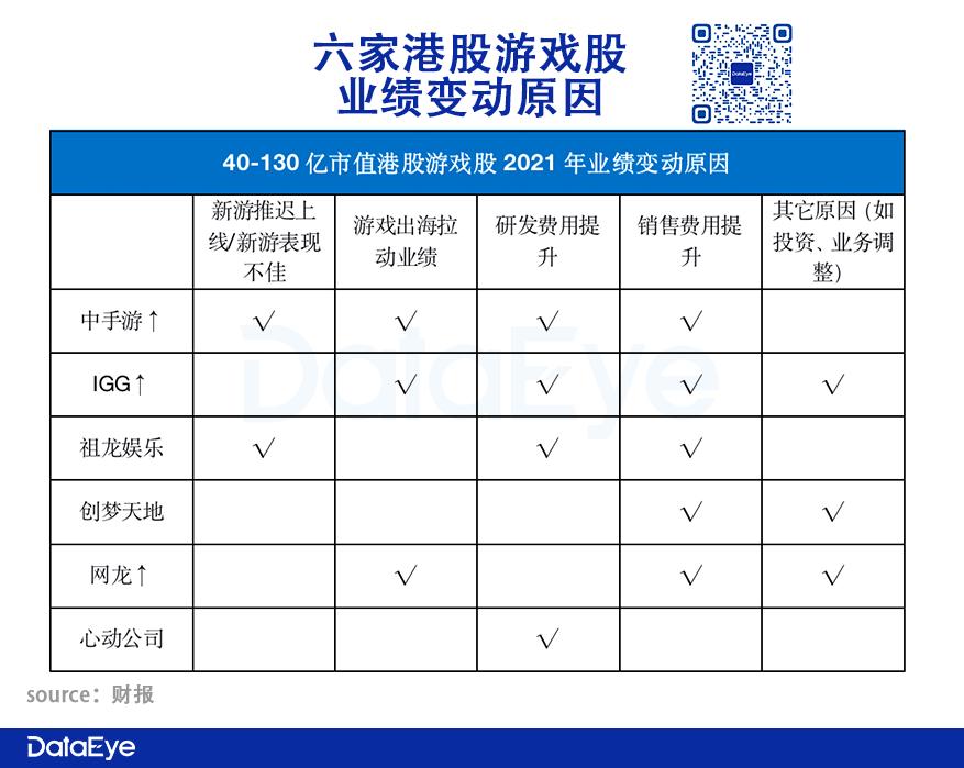 3、对比同行:港股体量40-130亿市值的游戏公司有中手游、IGG、祖龙娱乐、创梦天地、网龙、心动公司共六家。扣非归母净利润(橙柱)为正且同比改善的,仅中手游、IGG、网龙三家,其中中手游高增、网龙稳定、IGG微增。具体到业绩变动的原因,销售费用、研发费用的提升,是普遍问题,而游戏出海则是上述三家公司的主要增长引擎。