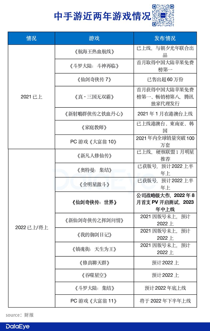 由于2022年预计上线产品较多,特别是包括了《仙剑奇侠传:世界》这样的战略级产品,DataEye研究院预计2022年半年报之后,中手游的业绩会更亮眼——2022、2023或进入收获期。