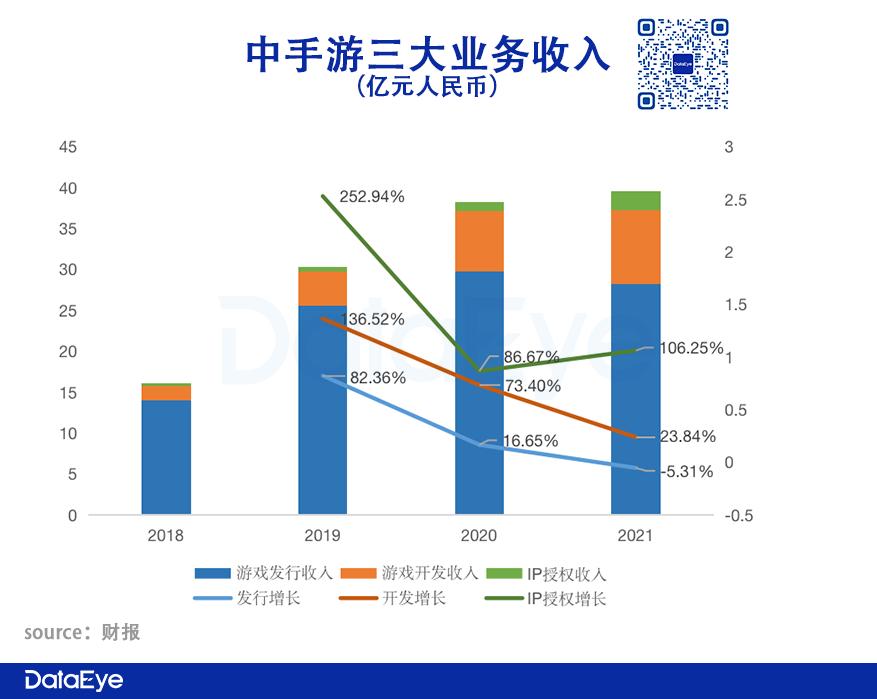 发行业务微跌,研发业务高增,IP授权翻倍。2021年,中手游发行收入下滑5%,增速进一步下滑,首次出现负增长,主要因为版号导致新游数量较少。公司主要增长引擎,首次切换成了增长近24%的开发收入,以及收入翻倍的IP授权业务(主要是仙剑IP)——发行转研发,IP授权成绩亮眼。