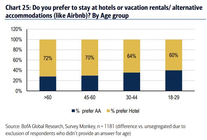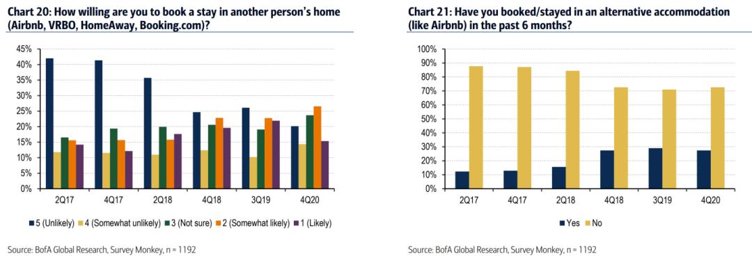 另外,随着以Airbnb为主的民宿出租平台的大力推动,根据美银的调查,美国居民对民宿等民宿的接受程度过往在逐年提高。而由于越年轻群体对民宿的接受度更高(18-29岁为40%,45-60岁为30%),我们认为未来居民对民宿的接受度也仍会继续提升。