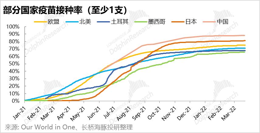① 病毒已广泛传播,当地民众接近“群体免疫”。因此疫情在欧美“来的快,去的也快”,在21年12月-22年2月间,欧美已基本渡过本次奥密克戎变种传播的爆发期。与之相比,中日韩防疫相对严格的国家仍在疫情爬坡期。