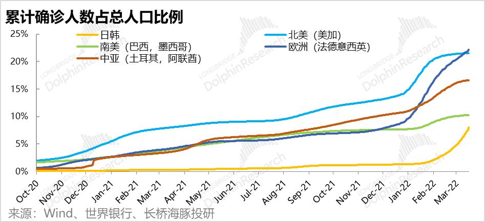 相比之下,相对严格防疫的日韩原先累计确诊数占总人口比例不足3%,但在奥密克戎的肆虐下正在快速爬升。