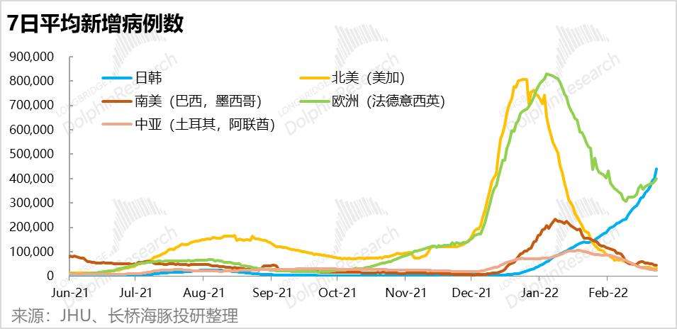 ②日韩还在飙涨中:进入疫情高峰时间较晚,传播速度相比欧美较慢(确诊病例的上升速率),目前尚未进入拐点。截至3月中旬日均确诊量也达到了40万人以上水平,与先前欧美的确诊高峰已同处一个量级,疫情也展现出失控的迹象。