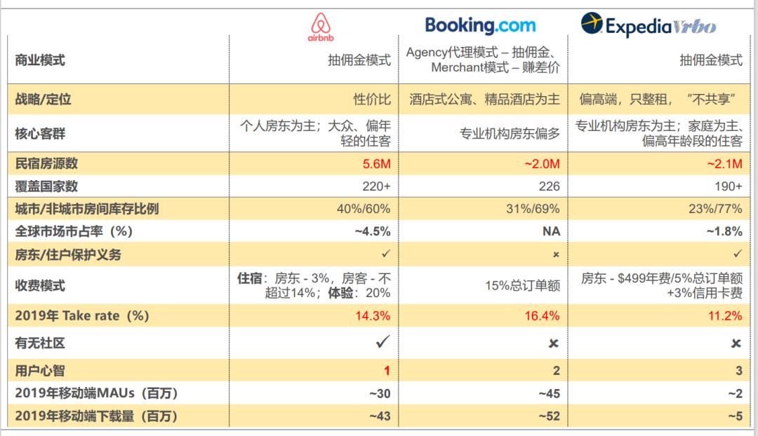 根据各公司的披露,截至2019年底,Airbnb共有570万间房源(到2020年3季度则有740万房源),同期Booking和VRBO则分别有约200万房源。