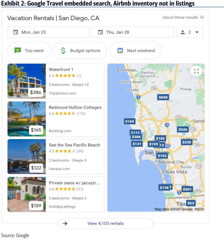 那么公司为何拥有大量的直接流量?我们认为除了公司品牌即品类的知名度,公司在第三方渠道上的策略也是原因之一。作为最大的公域流量来源,Google也推出了内嵌的短租查询功能,全球主要OTA平台都有入驻,而Airbnb则选择不参与。