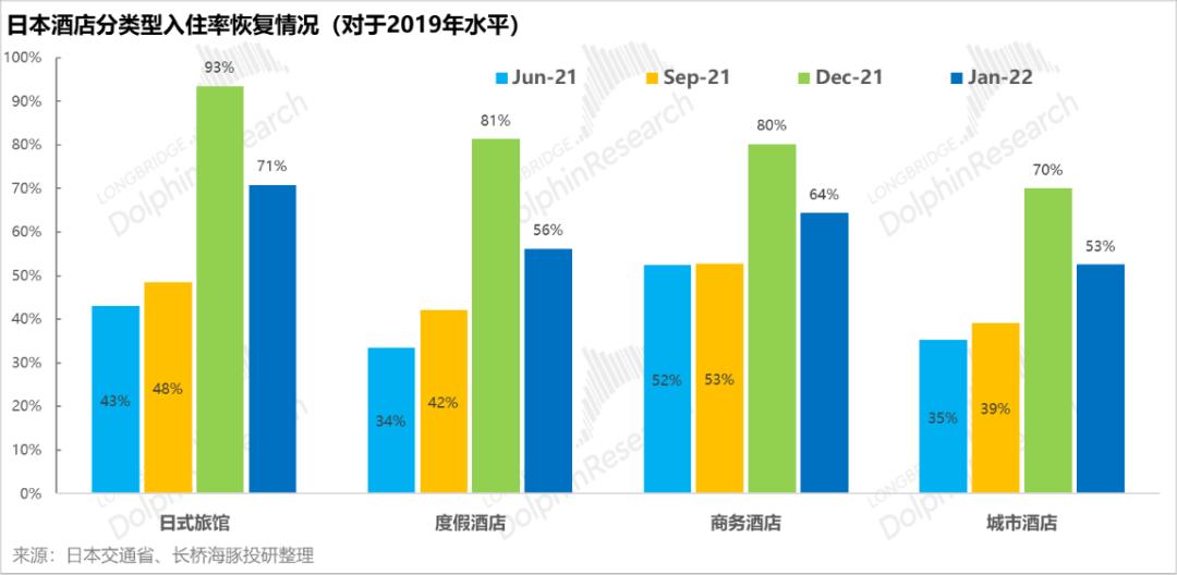 日本的酒店受更严格的出入境限制,且疫情传播处于爆发期,酒店入住率恢复情况也明显更差,到22年1月为19年同期的60%左右。