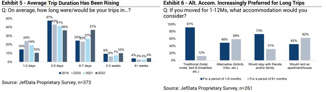 此外,就单次出行时间长短的变动趋势,据Jefferies的调查数据,我们可以看到1-5天以内的短期出行占比在2019-2022年期间在逐步降低,而6-7天甚至长达数周的长住比率则逐步上升。虽然尚不明确背后的驱动因素,但随着住宿时间的拉长,类似民宿这种拥有厨房、起居室等更富“家”的属性,更贴近当当地居民生活方式的住宿类型,比起酒店会更受欢迎。而Jefferies的调查数据也体现出,居住时间越长的用户会更偏好于租住民居。
