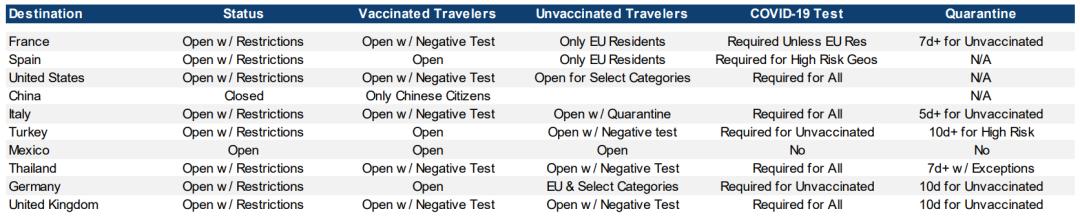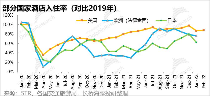 ② 由于疫情高峰已过,且防疫措施继续松绑,截至22年3月美国的航班和酒店入住率已基本恢复到19年90%的水平,而欧洲的恢复情况在80%左右。可以说,欧美出行已基本自由,恢复到疫情前的常态。