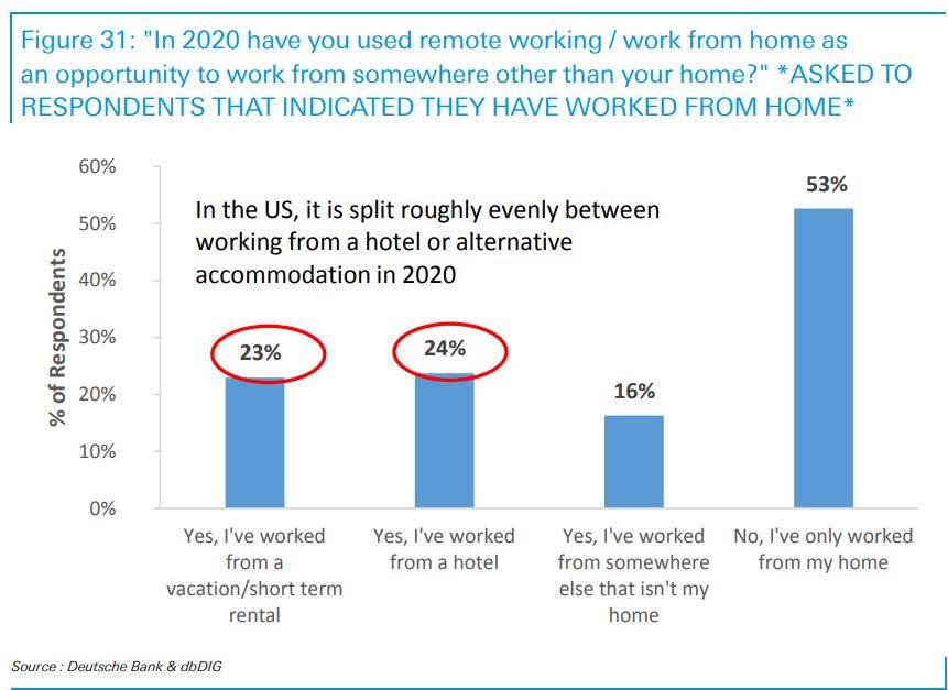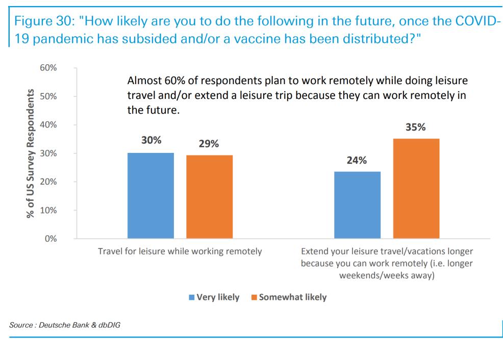 更灵活的办公时间和地点安排将从两方面创造更多的短柱需求。首先,远程办公会本身会产生的短住需求,根据德银调查,接近半数的美国人在远程办公时并未在家居住,而约有23%的人会曾居住在度假地或短租民宿中,与居住在酒店办公的比率基本相当。