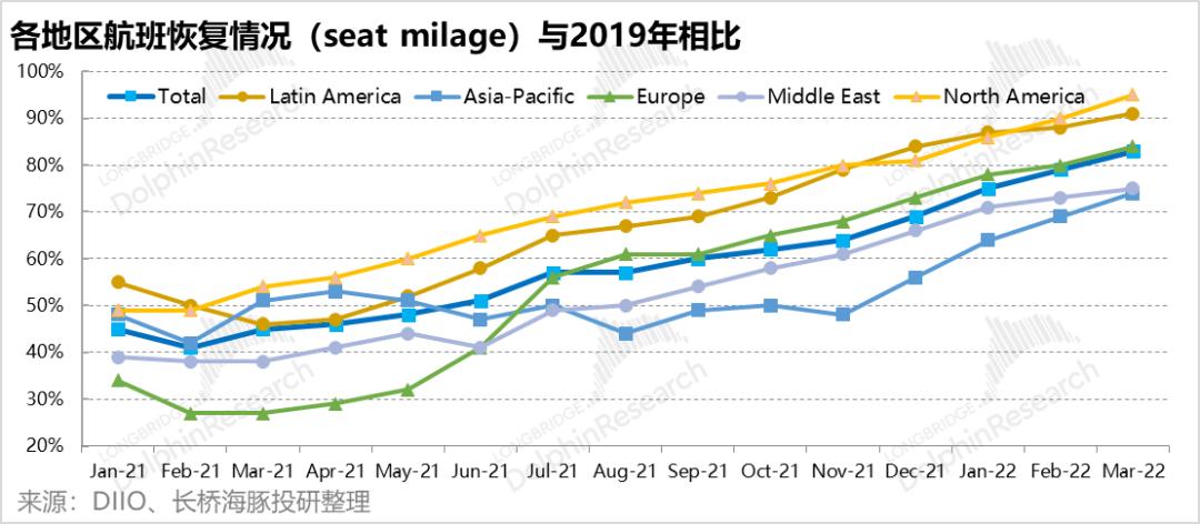 而与度过疫情高峰的先后顺序一致,全球各地区航班恢复由快到慢也按照美洲、欧洲、中东和亚洲的顺序。根据第三方数据,北美(包括南美)的航班线路恢复情况最好,到3月已恢复到疫情前19年90%以上的水平,航空出行基本没有障碍。欧洲的航班恢复情况次之,已恢复到19年的80%以上。与之相比,亚洲及中东航班的恢复程度最差,约为2019年同期水平的75%。