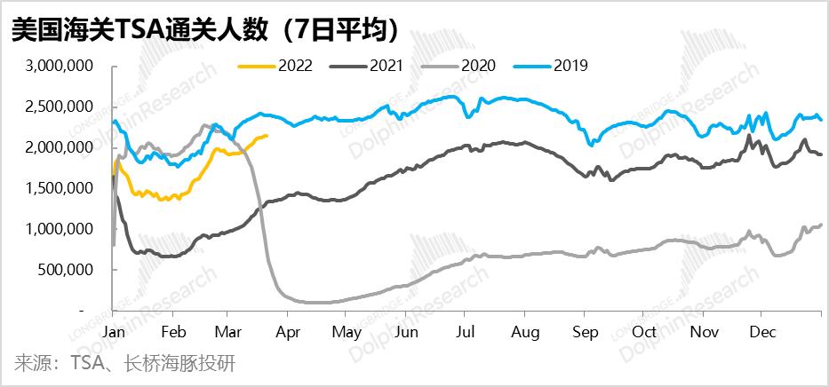 由于美国已度过疫情高峰,且防疫政策宽松,目前出入境美国已基本自由。根据美国海关数据,到22年3月下半月,美国口岸日均通关人数在200万人以上,已恢复到19年88%-90%的水平。