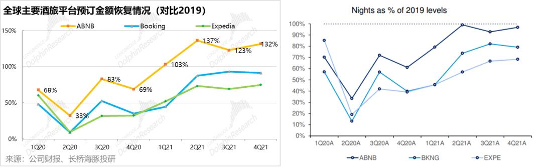 而Airbnb凭借在民宿赛道内的绝对领先地位,以及民宿赛道自身更高的成长性,到21年4季度Airbnb的间业预订间夜量已完全恢复到19年水平,且由于预订结构在疫情间向客单价更高的美国倾斜,Airbnb平台上的预订金额(Gross Booking Value)更是已达到19年水平的132%,可见Airbnb在旅游出行平台中独有的高成长性。