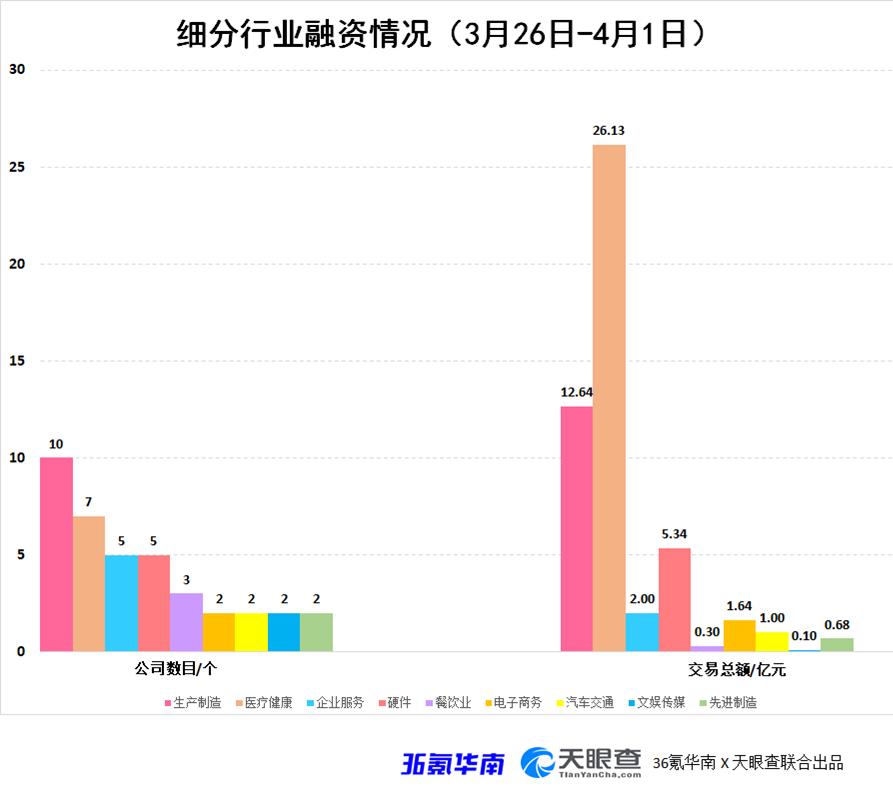 本周融资主要分布在生产制造、医疗健康、企业服务和硬件行业;医疗健康行业披露的交易总额金融领域最多,为26.13亿元。