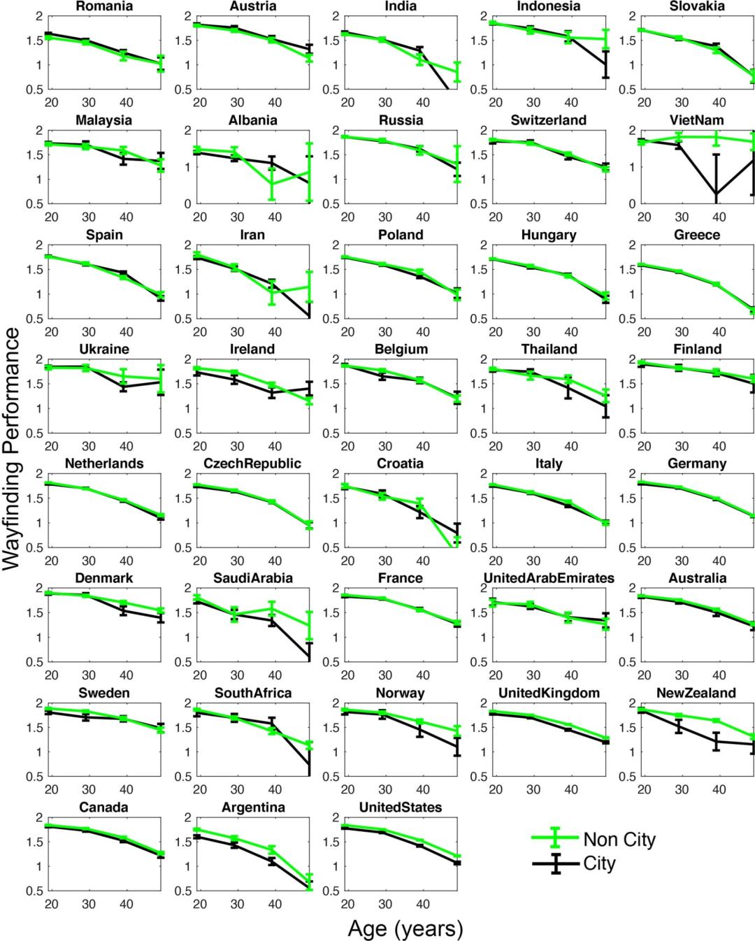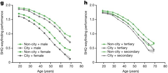 因此,研究人员假设来自城市的参与者在需要更短轨迹的游戏关卡中会有更好的找路表现。