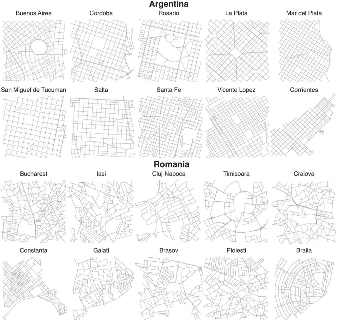 经过计算,研究人员得出了38个地域最大城市的平均街道网络熵值 (SNE):网格状城市(例如芝加哥)的SNE较小,而结构更有机芜杂的城市(例如布拉格)的SNE较高。