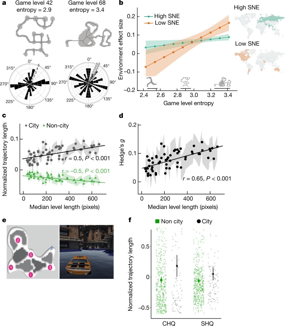 a. 游戏第42关与68关轨迹的空间熵值分布;b. 42个找路关卡中每个关卡的熵值与高/低SNE地域参与者表现的函数曲线斜率;c. 标准化的参与者手指滑动轨迹长度与游戏关卡路径长度中位数的函数图;d. 参与者生长环境影响与与游戏关卡路径长度中位数的函数图;e. 《城市英雄》的游戏截图。