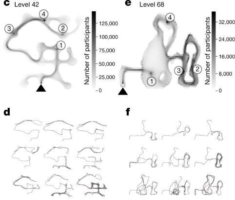 c、e. 分别为第42与68关所有玩家的轨迹热图,其中黑色三角为起始点,带圈数字为参与者被要求达到的关卡记录点;d、f. 分别为第42与68关部分玩家的轨迹示例。