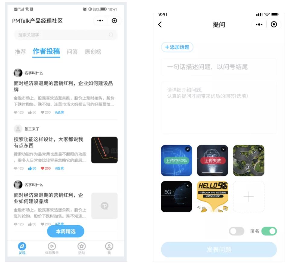 如下面这2个图,一个是PMTalkApp首页信息流、一个是提问内容编辑页面,看这2个页面其实包含了多个功能。