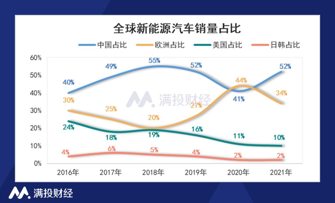 中国是全球最大、发展最快的新能源汽车市场,市场份额领跑全球。根据乘用车市场信息联席会数据,2021年中国新能源汽车销量占比为52%,超越欧洲,重回第一;欧洲市场因为补贴退坡,占比回落至34%;美国和日韩的占比为10%和2%。