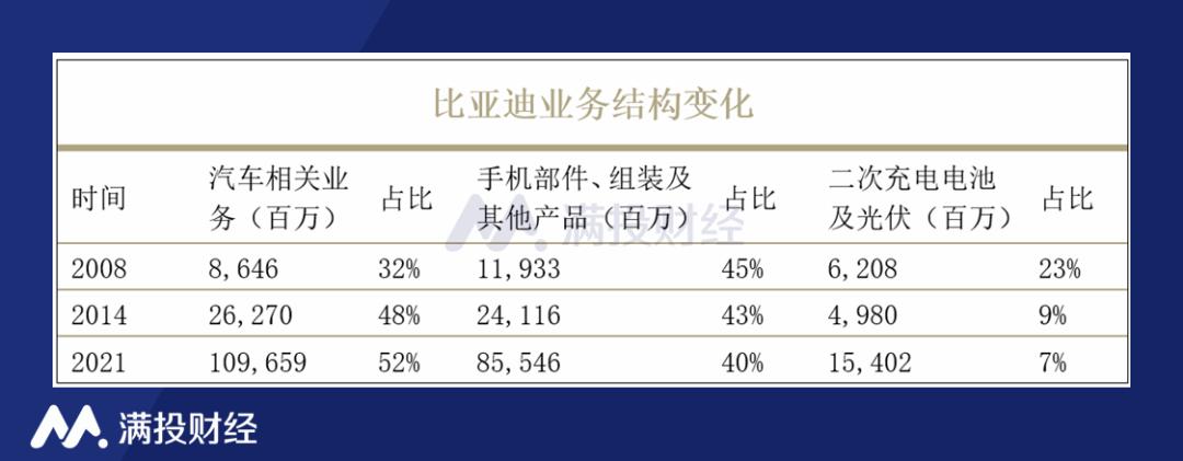 截至2021年年报数据,比亚迪的汽车业务实现收入1096.6亿元,占比稳步提升至52%,占据了比亚迪总收入的半壁江山。手机部件业务的收入为855.5亿元,占总收入的40%,比亚迪这块业务也占据较高的比重,但随着汽车业务的快速发展,比重也有所下滑。二次充电及光伏业务的收入为154.0亿元,占比仅7%,与2008年及2014年相比,比亚迪这块业务收缩明显。