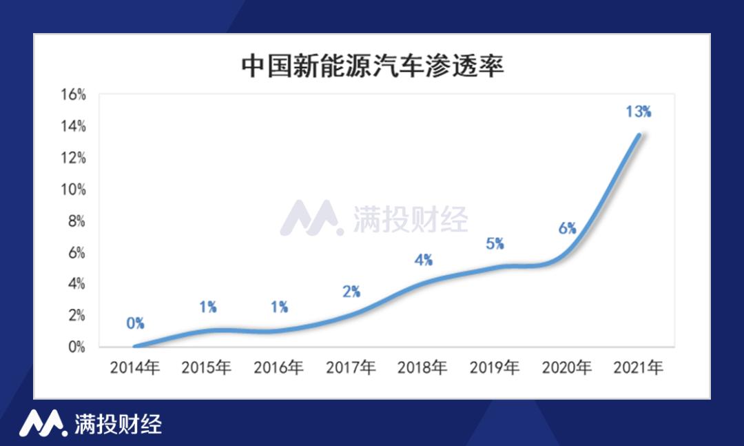根据中汽协数据,2021年,新能源汽车产销分别完成354.5万辆和352.1万辆,同比均增长1.6倍。得益于国内新能源汽车产销量的快速增长,中国新能源汽车的渗透率也迅速攀升,特别是2021年以来提升速度进一步加速,2021年,中国新能源汽车的渗透率达到13%,而2020年仅6%。其中,12月单月新能源汽车渗透率达到19.1%,持续高于上月。