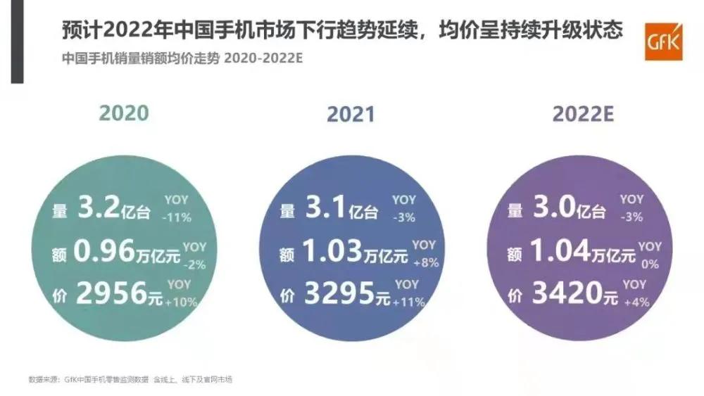 而根据GFK数据则显示,2021年的全年手机销量为3.1亿台,处于低谷。2022年的全年将持续延续下行趋势。