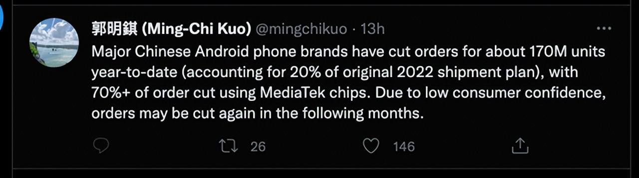 而天风国际分析师郭明錤在社交媒体上表示,国内各大安卓手机品牌今年迄今已削减约1.7亿部订单(占2022年原出货计划的20%),其中70%以上的订单使用联发科芯片。由于消费者信心低迷,在接下来的几个月里,订单可能会继续减少。