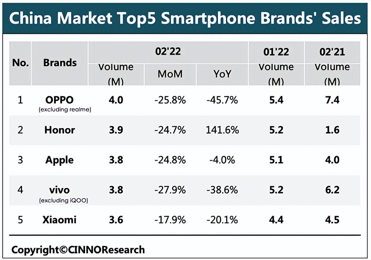 中国信息通信研究院发布手机报告显示,2022年2月,国内市场手机出货量1486.4万部,同比下降31.7%,国产品牌手机出货量1278.3万部,同比下降34.7%。也就是说,2月份国内手机出货量跌了三成多。