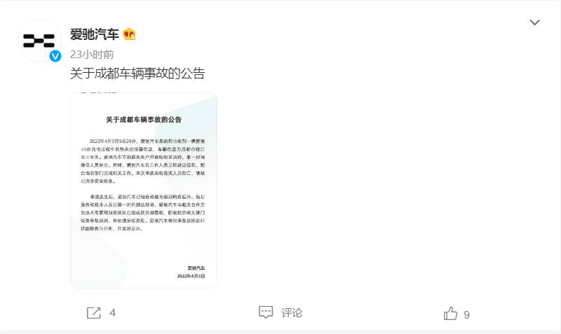 虽然爱驰汽车及时发布了声明,但似乎并未收获网友关注,在声明发出近24小时内,无一人回复,只有9人点赞。
