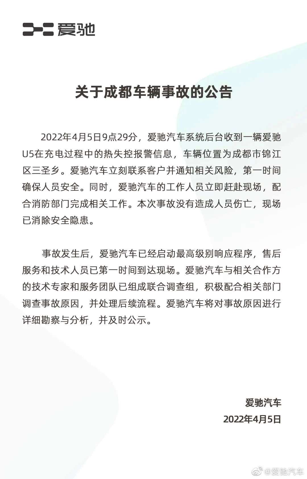 4月5日,四川成都锦江区白桦林路旁电动汽车充电站内,一辆网约车爱驰U5自燃,大火很快将车辆吞没。当日下午,爱驰汽车官微发布公告称,其系统后台收到一辆爱驰U5在充电过程中的热失控报警信息,车辆位置为成都市锦江区三圣乡。事故没有造成人员伤亡,事故原因正在调查。