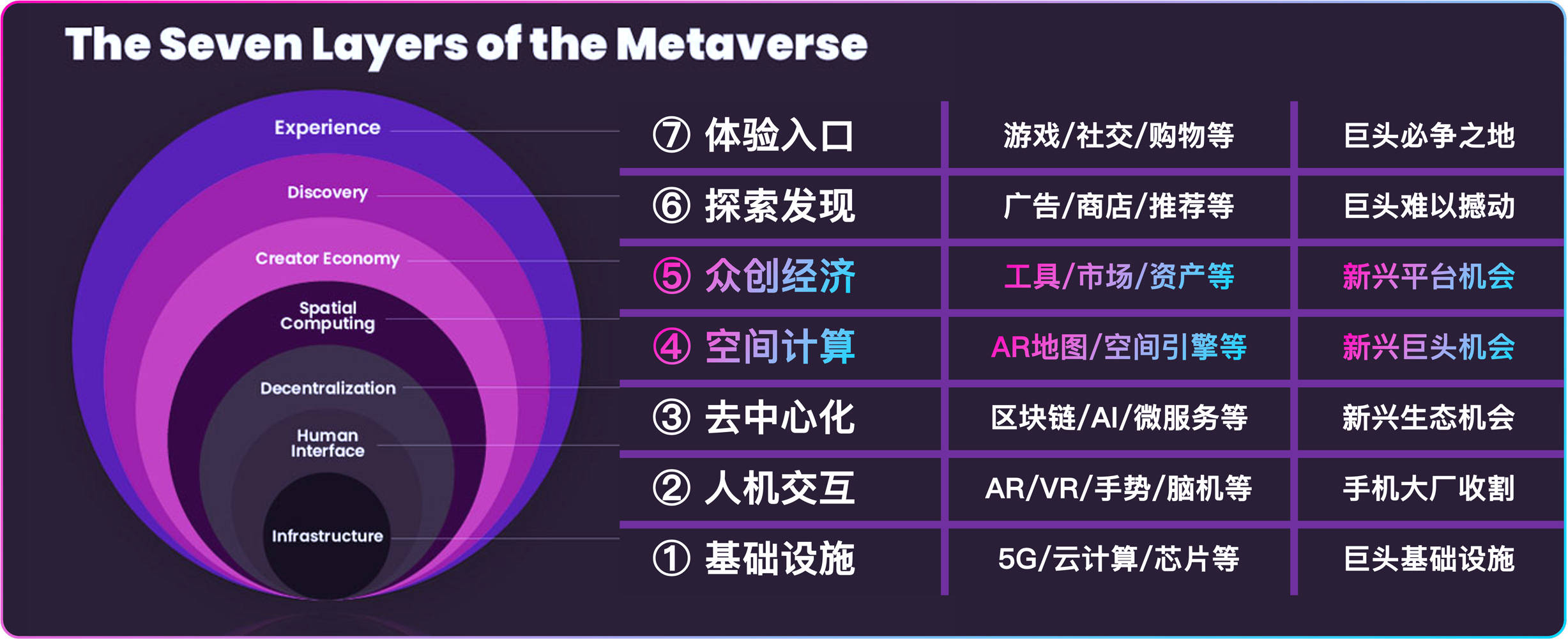 从行业认知来看,基础设施、人机交互、去中心化、空间计算、众创经济、探索发现、体验入口,由内到外的元宇宙七层模型,是业内公认具备可行性的产业链模型。