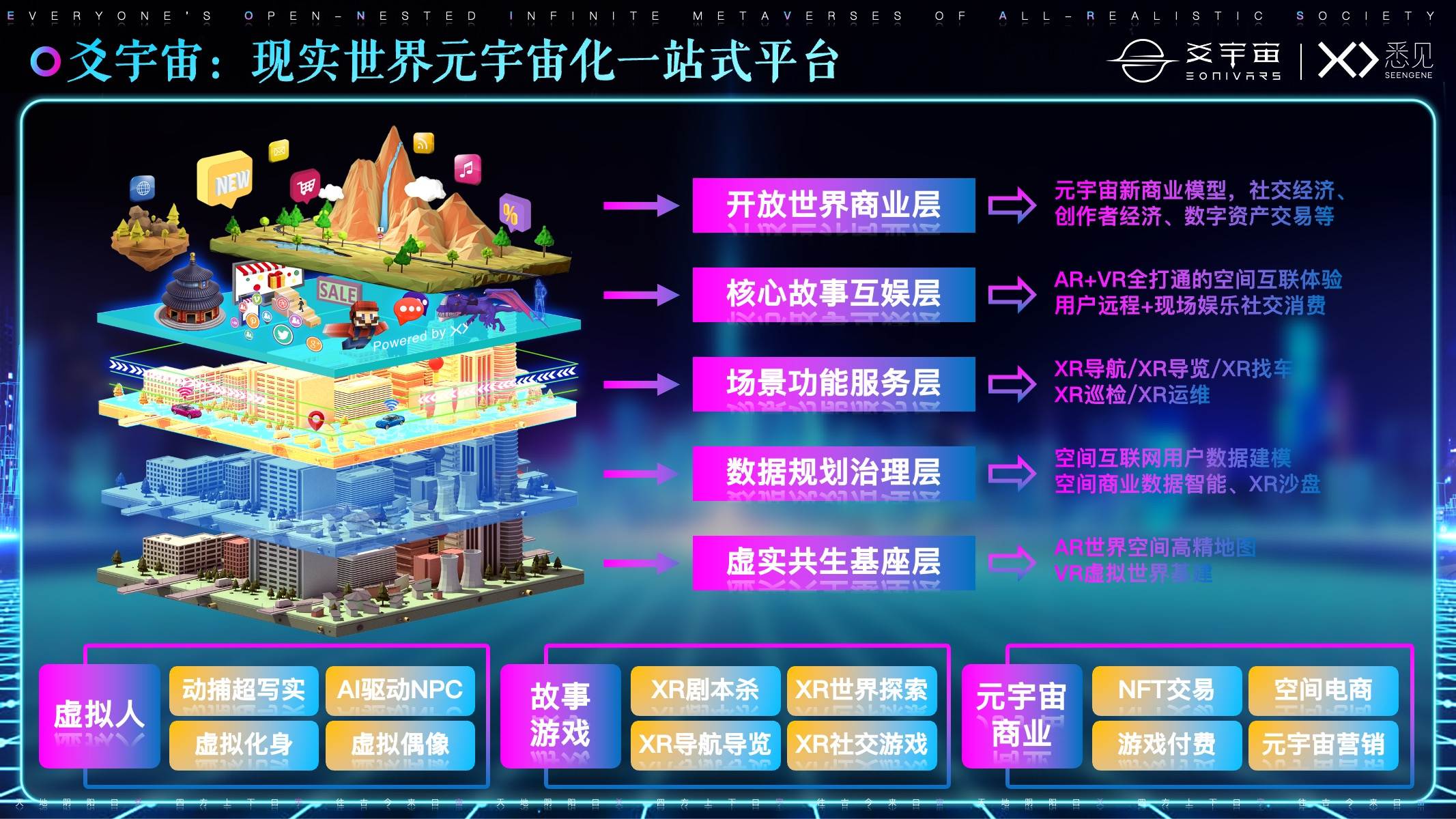 基于案例实践和商业洞察,爻宇宙提炼了现实世界元宇宙化的一些共性,搭建了一个涵盖虚拟世界基座、数据规划治理、场景功能服务、核心故事互娱、开放世界新商业模式在内的虚实共生产业模型。