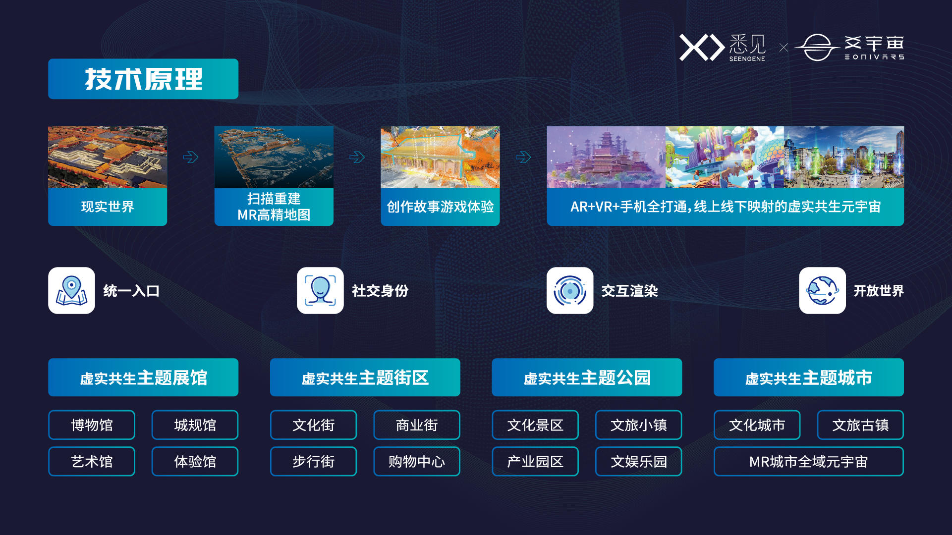 第三步,爻览作为体验入口,适配AR、VR、手机等全终端,实现线上线下互通,让游玩、消费、社交等多种用户行为在构筑的虚拟共生世界中存在统一入口。