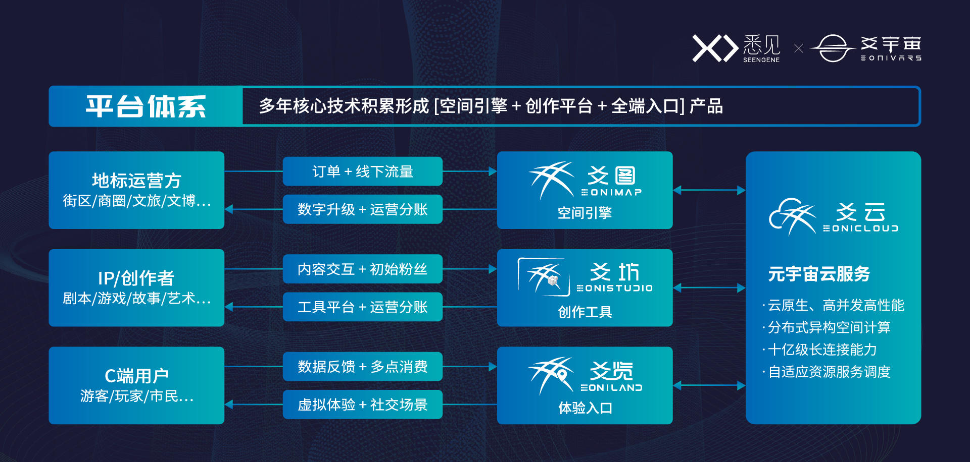 爻宇宙的诞生,是刘怀洋与悉见对一站式虚实共生元宇宙搭建平台的尝试。悉见在空间互联网(即虚实共生元宇宙)方面建树颇多,储备混合现实高精地图、深度学习神经网络、异构架构并行计等多领域核心技术。产品层出发,爻宇宙包含爻图EoniMap、爻坊EoniStudio 、爻览Eoniland、爻云EoniCloud四个组件,以工具化的形式让构筑专属虚拟世界的门槛降低。