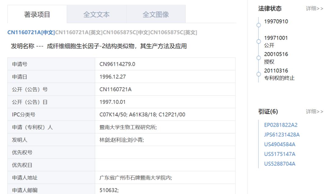 根据客服给出的专利证书显示,对于“成纤维细胞生长因子-2结构类似物 其生产方法及应用”这一发明专利,专利权人的确为暨南大学生物工程研究所。