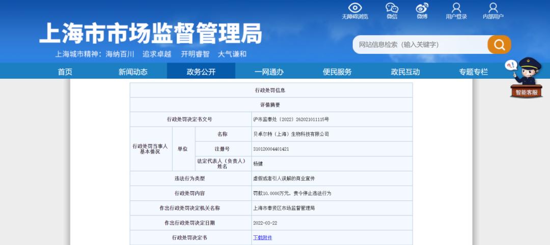 根据相关法规规定及违法情节轻重,贝卓尔特(上海)生物科技公司被处以罚款10万元整。