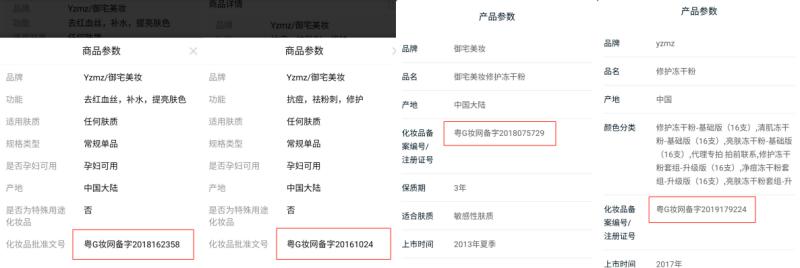 而在淘宝和拼多多两个平台上,记者查到该款产品至少有4个不同的备案号。