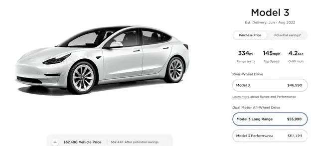 具体来看,Model 3 Long Range(长续航版)的起售价调整至55990美元,相比此前的54490美元上调了1500美元;Model 3 Performance(高性能版)的起售价调整至62990美元,相比此前的61990美元上调了1000美元;Model 3后轮驱动版则没有调价,依然为46990美元。