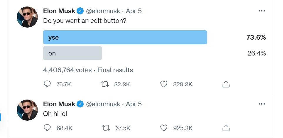 马斯克在入股推特后发起了投票:“你们需不需要一个编辑按钮?”