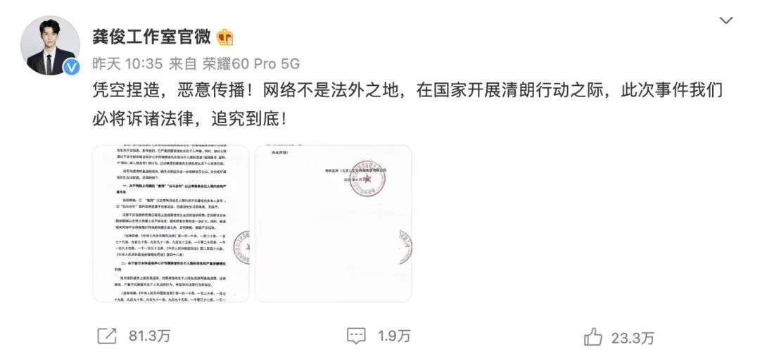 很快,@龚俊工作室官微发布声明,称网络上传播的“唐筛”“白马会所”以及辱骂其他艺人等内容严重失实,并指出部分主体盗用并公开传播龚俊个人隐私信息的行为严重涉嫌侵权。
