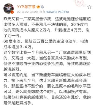 据知名汽车博主颜宇鹏爆料,30多千瓦时的电池的采购成本从原来的不到2万元升至4万元,涨价近一倍;而主流采用的60千瓦时电池成本增加了3-4万,这超出了很多人的预期。