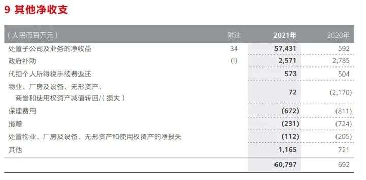 在其它净收支中,“处置子公司及业务的净收益” 2021 年就达到了 574.31 亿人民币。